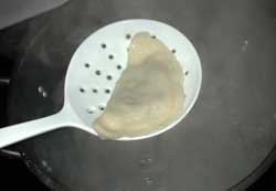 Using a wide slotted spoon, lower the Varenyky into the boiling water. Doing it this way, it keeps it from being damaged if it was just dropped into the pot, as well as keeping you from getting burned. Once in the pot, give the water a gentle swirl. This keeps it from sticking to the bottom when it first gets in the water. We like the plastic spoon better over a metal spoon. The metal spoon has a sharper edge and is more likely to accidentally cut the Varenyky. |