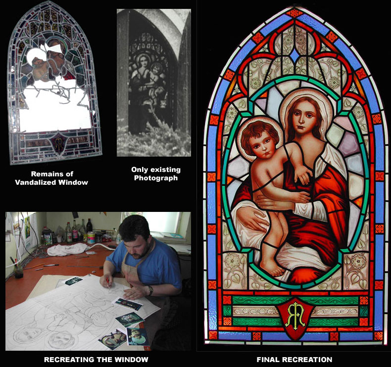 Icon of the Holy Virgin and Christ. 2003 Recreation of a vandalized 1930's stained glass window from a family owned chapel. With only a tiny picture of the window in the background of a b&w photo and photos of the mangled remains, Anatoli recreated the original window to even greater brilliance.